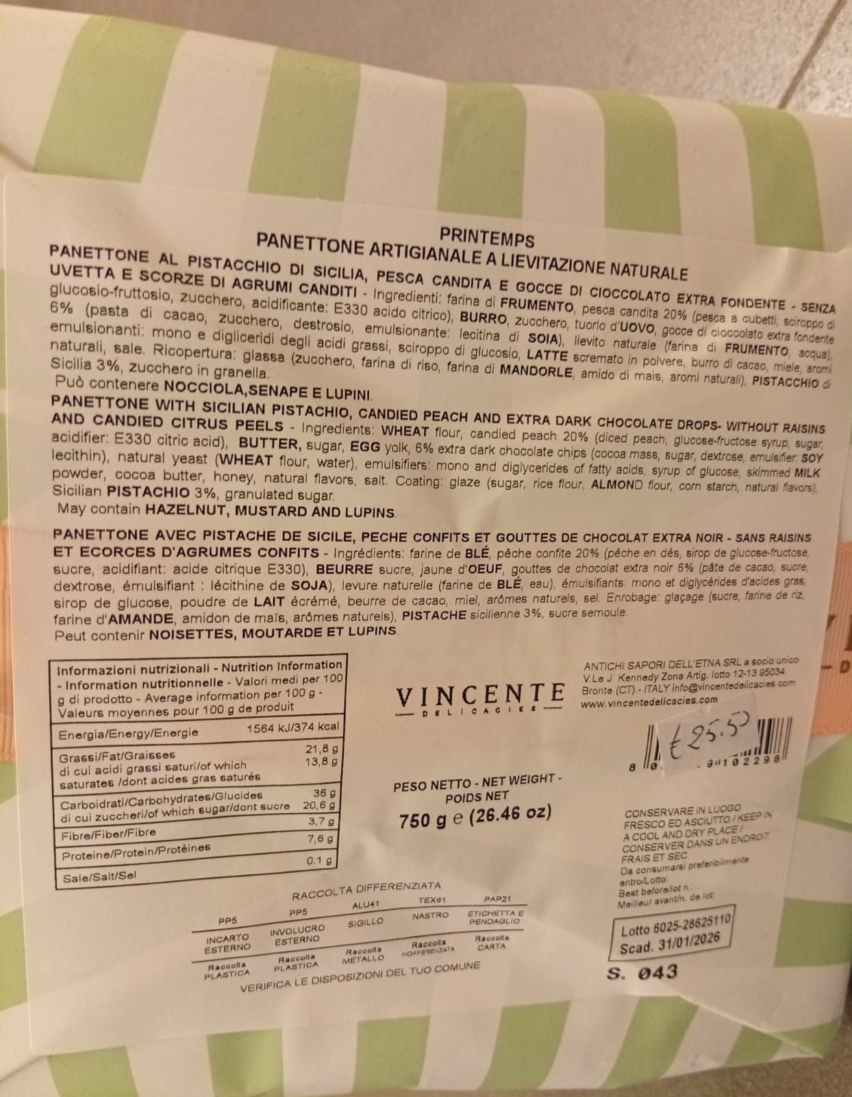 • "PRINTEMPS" c/pistacchio di Sicilia pesca e gocce di cioccolato extrafondente 70% 750g