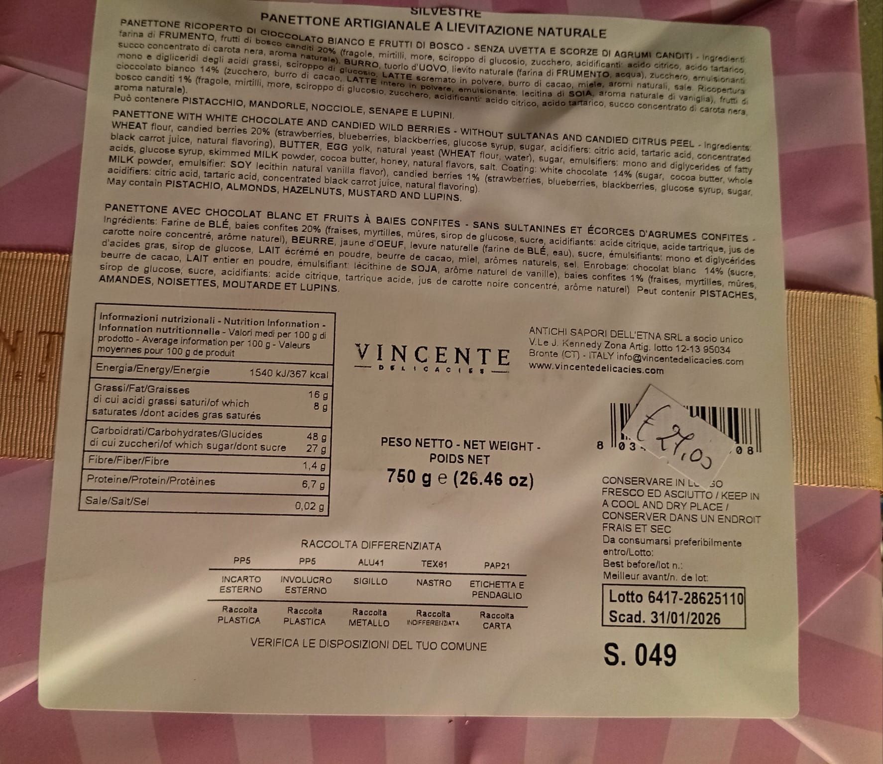 • "SILVESTRE"ricoperto di cioccolato bianco c/frutti di bosco canditi 750g